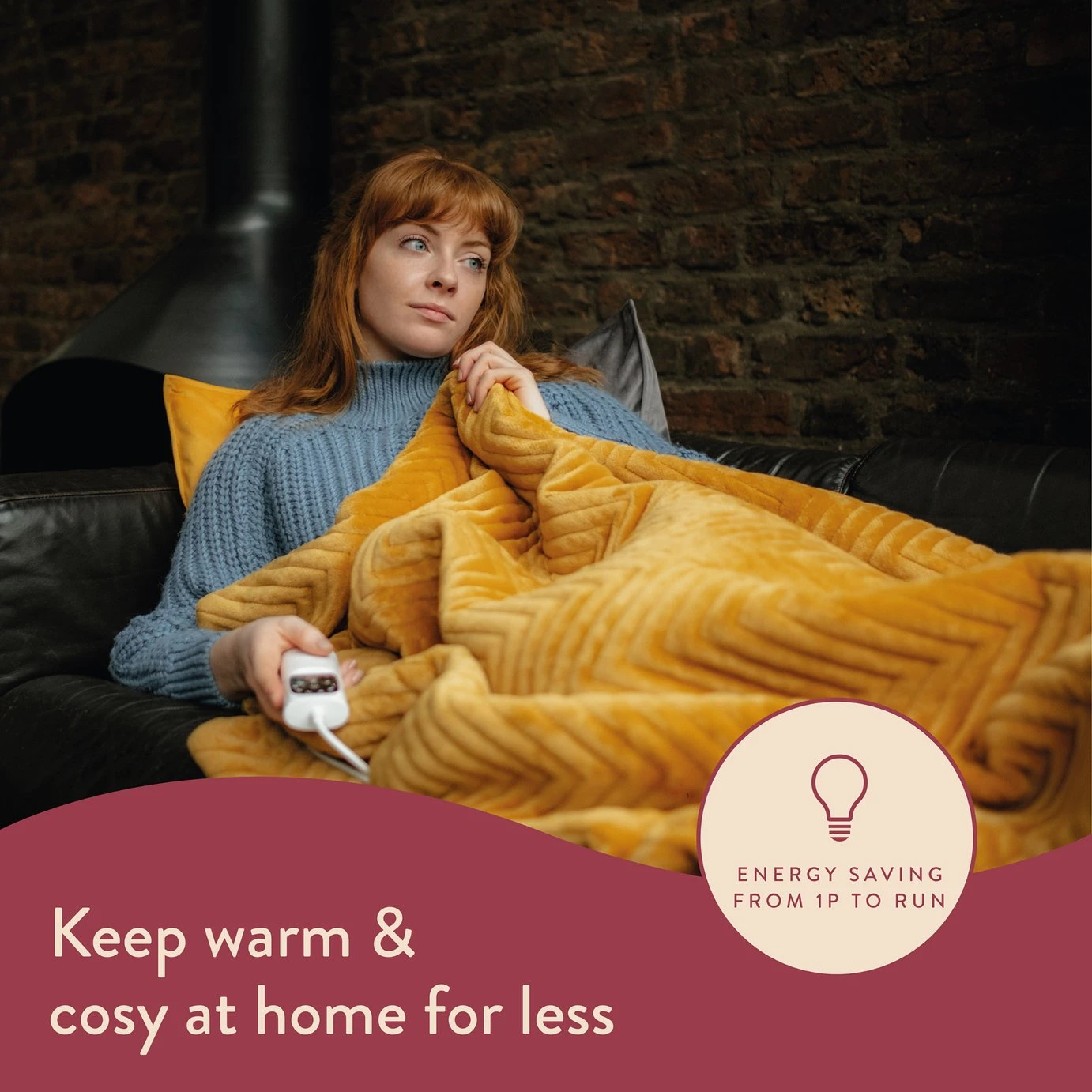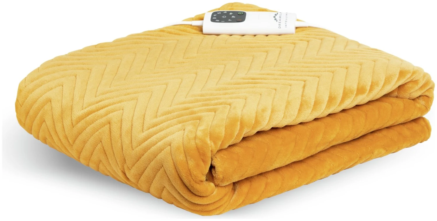 Luxurious quilted velvet warming throw in Mustard, featuring a contemporary herringbone pattern perfect for solo snuggling or shared cocooning. And when you’re not requiring the warmth and wellbeing benefits, it cleverly doubles up as a lavish living room accessory. 5 minute fast heat up, 6 temperature settings, auto shut off timer. It’s machine washable and tumble dryer safe; simply detach the digital control. Comes with a reusable storage bag and 2 year guarantee. Energy saving, costing from only 1p to run.