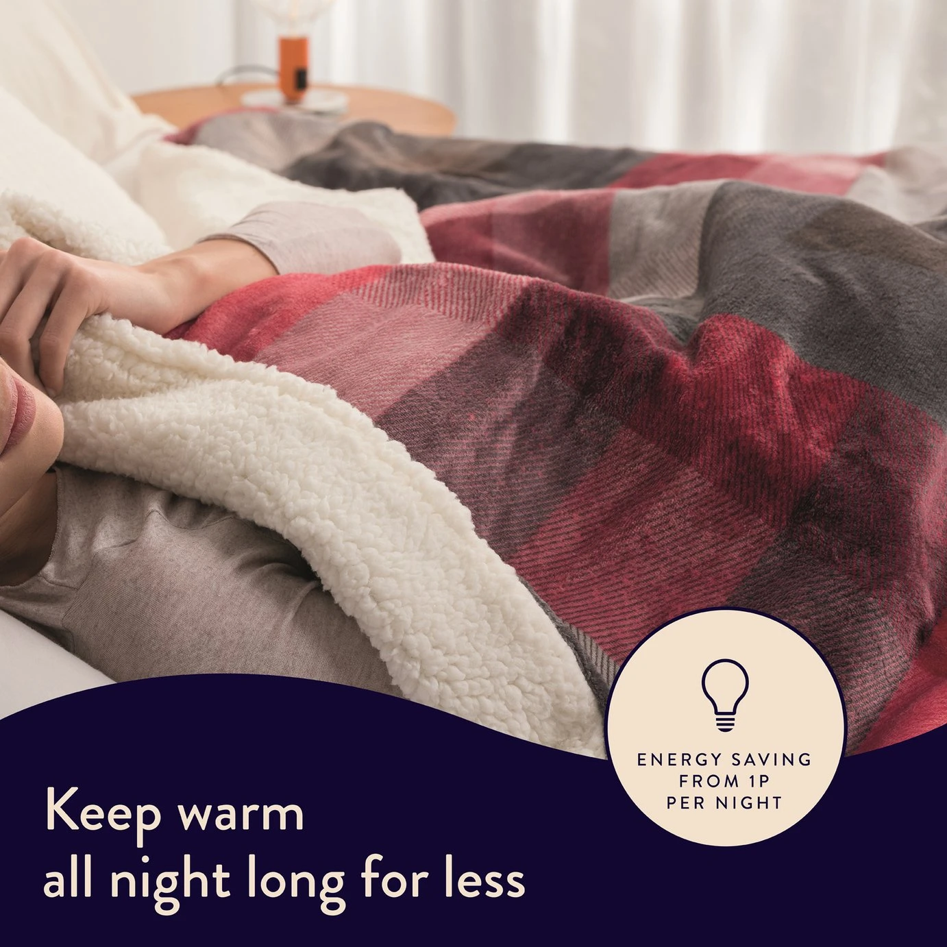 A hybrid design to help you sleep or unwind, wrap yourself in teddy-bear softness with our nap time warming blanket. Supersized and super soft, it features the best of both worlds – plush, velvety check combined with a Sherpa-style fleece that’s both cosy and chic. 5 minute fast heat up, 6 temperature settings with auto shut off timer. Machine washable and tumble dryer safe; simply detach the digital control. Comes with reusable storage bag and 2 year guarantee. Energy saving, costing from only 1p to run.