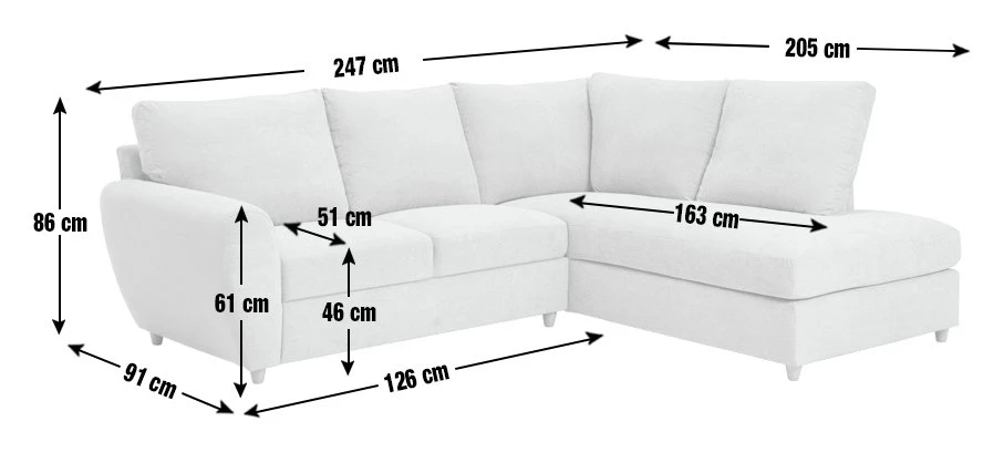 Stretch out and sink into our modern comfy chaise. With deep pocket sprung seats and an abundance of plump cushions this sofa was made for lounging. Upholstered in grey fabric with warm toned wooden feet.