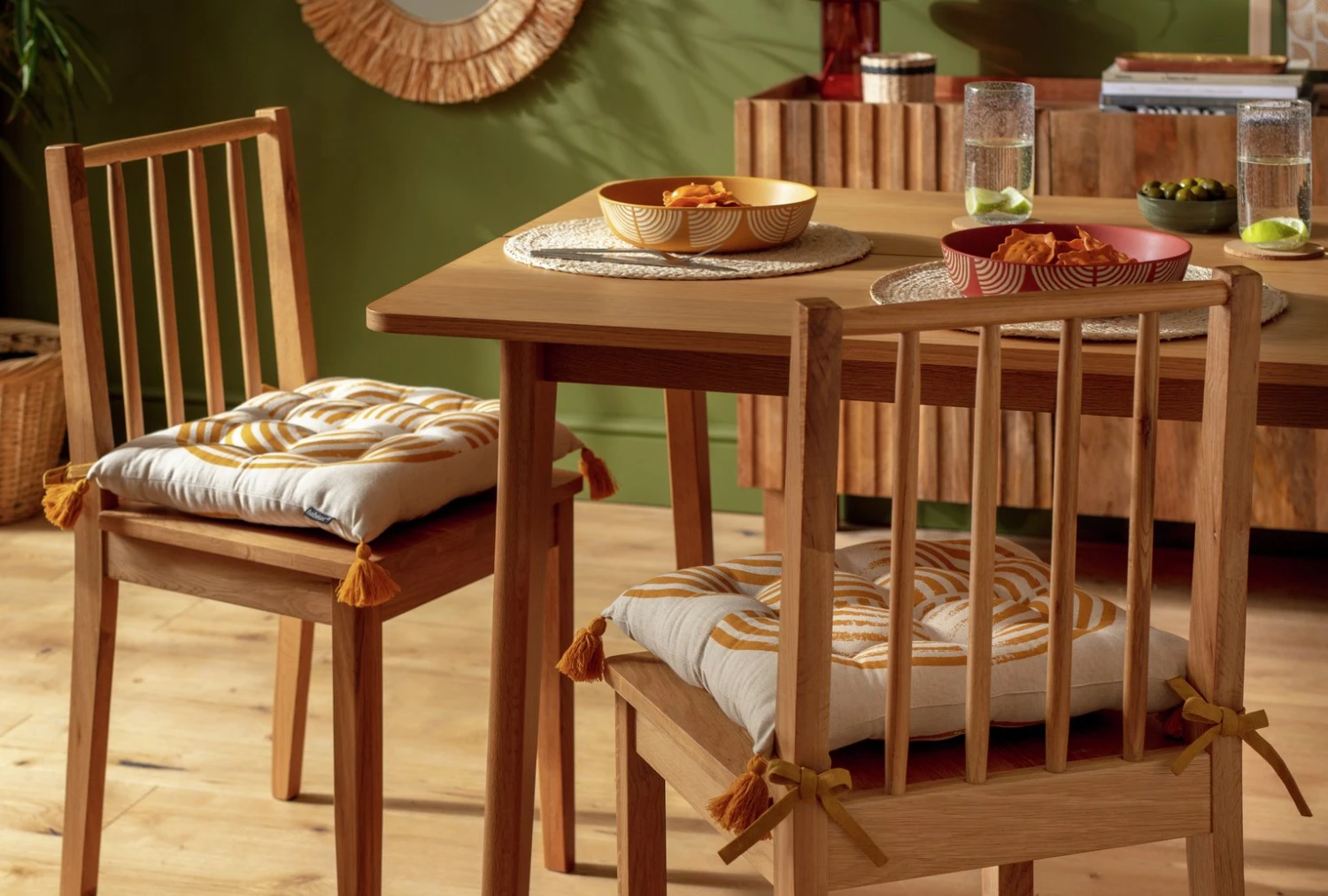 Designed exclusively in-house, this pair of orange and cream patterned seat pads are a smart way to add instant comfort and pizazz to a chair. Plumply stuffed with recycled wadding, each cushion is stylishly tucked and features orange corner tassels and orange ties.