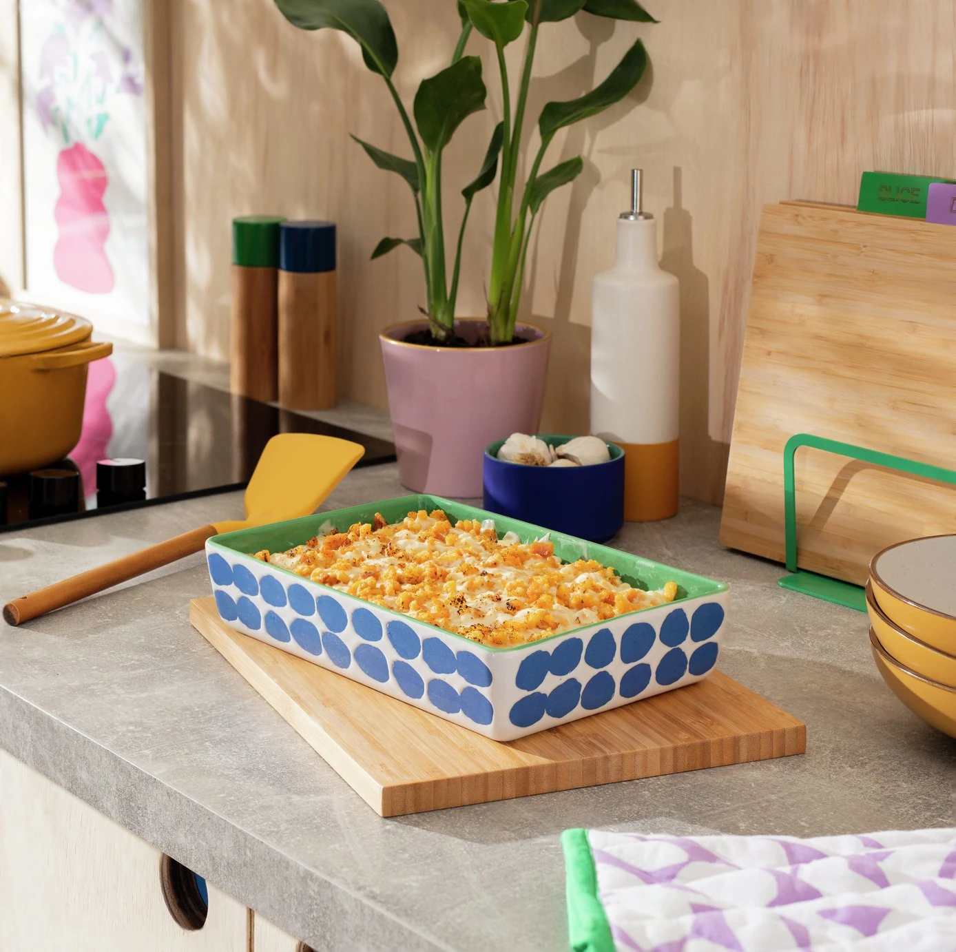 Ready for roasties? We are. Our gorgeous emerald and blue rectangular ceramic roaster features a peppy blue large dot design. A riot of cheerful colour and perfect for oven to table serving. Delicious crumbles, yummy spuds, roasted veg or lasagne. What’s on the menu today?