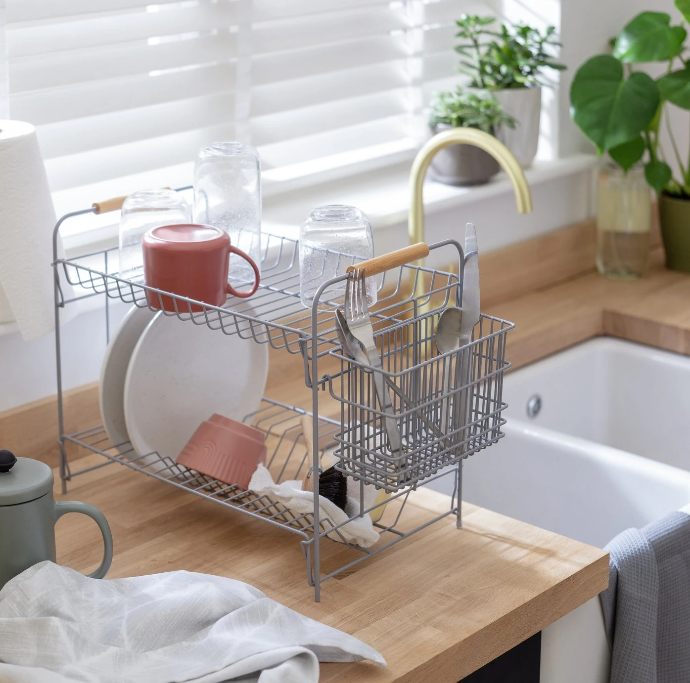 Dishes, on the double. Our 2 tier wire drainer is a modern way to dry your crockery and cutlery. In grey steel, this sturdy stand holds plenty of plates, mugs and glasses. Pop knives and forks in the handy side basket. Handsomely industrial, it slots right into a contemporary kitchen. With a pair of bamboo handles, it’s easy to move about, too. It’s cool to be clean.