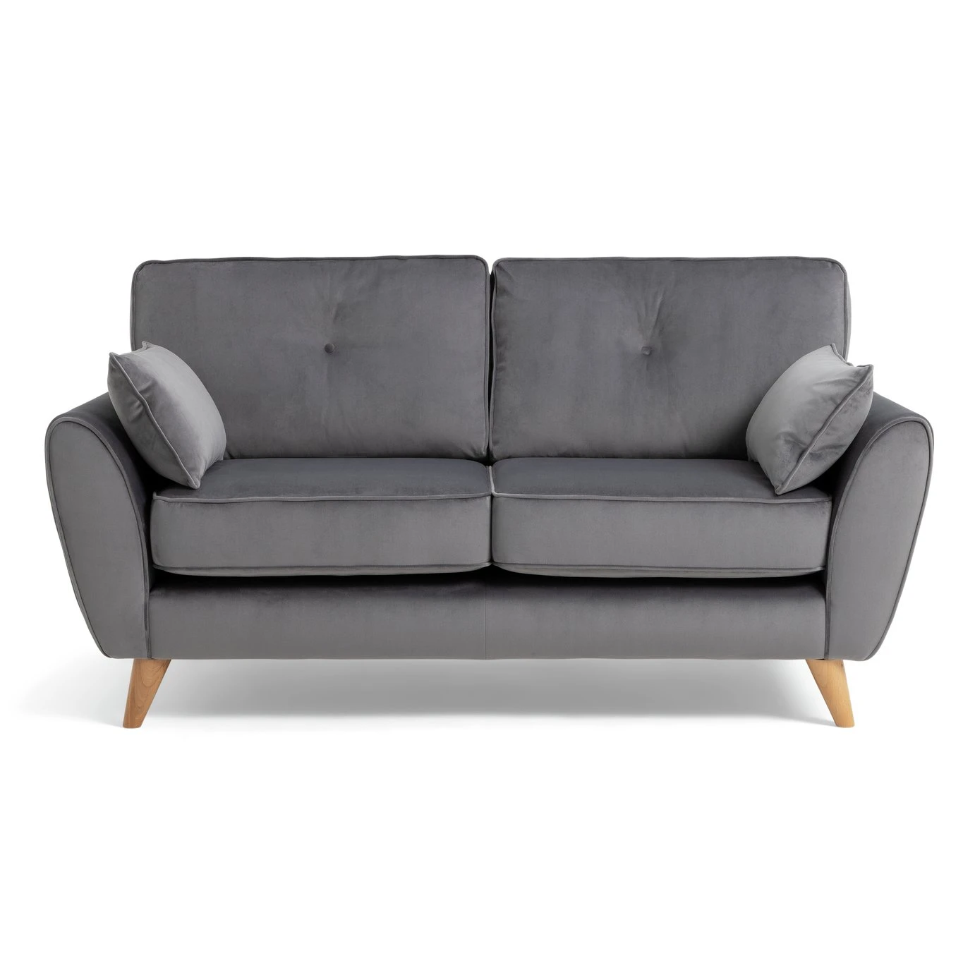 Retro chic. Upholstered in grey velvet, our 2-seater Iris sofa features mid-century modern touches. Check out the clean curves, button back removable cushions and splayed beech wood legs. Relax into the comfy removable seats, arrange the 2 scatter cushions and settle in.