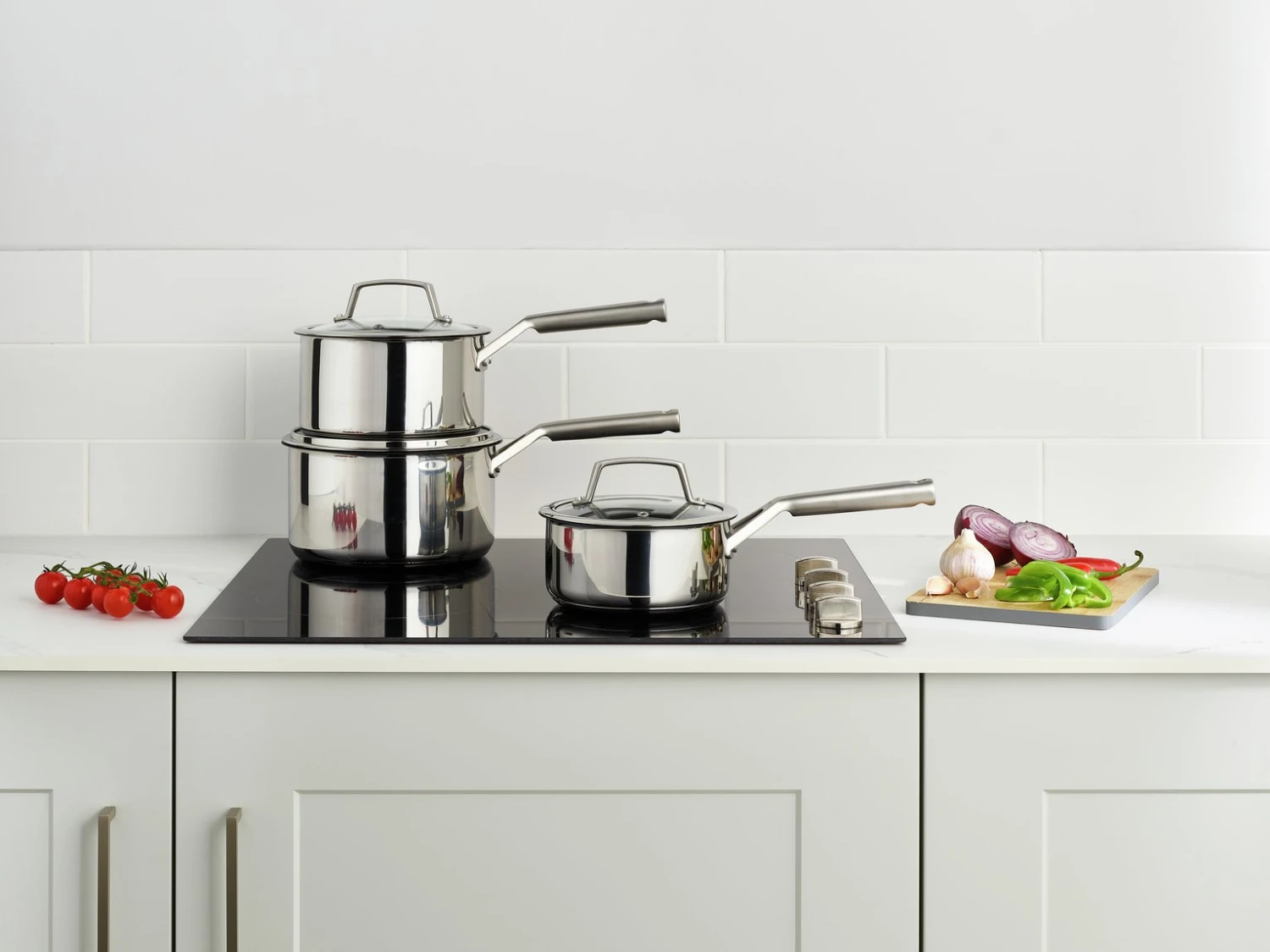 This 3-piece pan set includes 16cm, 18cm and 20cm saucepans with heat tempered glass lids – the perfect starter set, home gift or kitchen update.