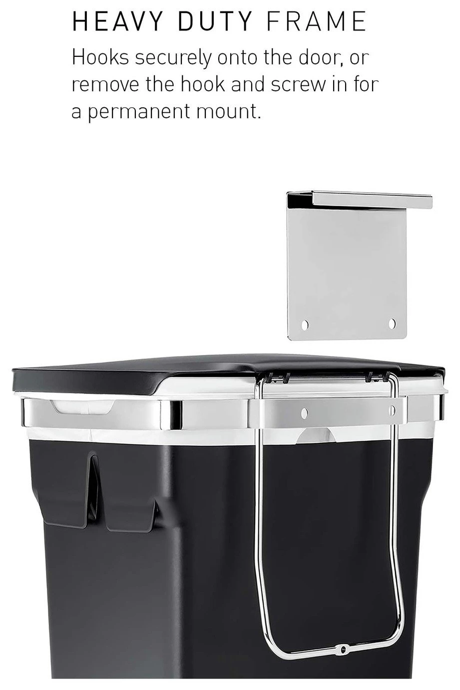 This in-cabinet bin hangs inside your kitchen cabinet door for quick and easy access while you are busy at the kitchen counter. The heavy-duty steel frame hooks securely onto the door or can be screwed in for a permanent mount. It also holds a durable plastic bucket that keeps your cabinet free from messy spills and lifts out for easy cleaning. Suitable for use in cabinets with a minimum depth of 23cm. When using the hanging bracket the top of the bin is 5cm below the top of the hanger. Watch out for pipes and other obstructions.