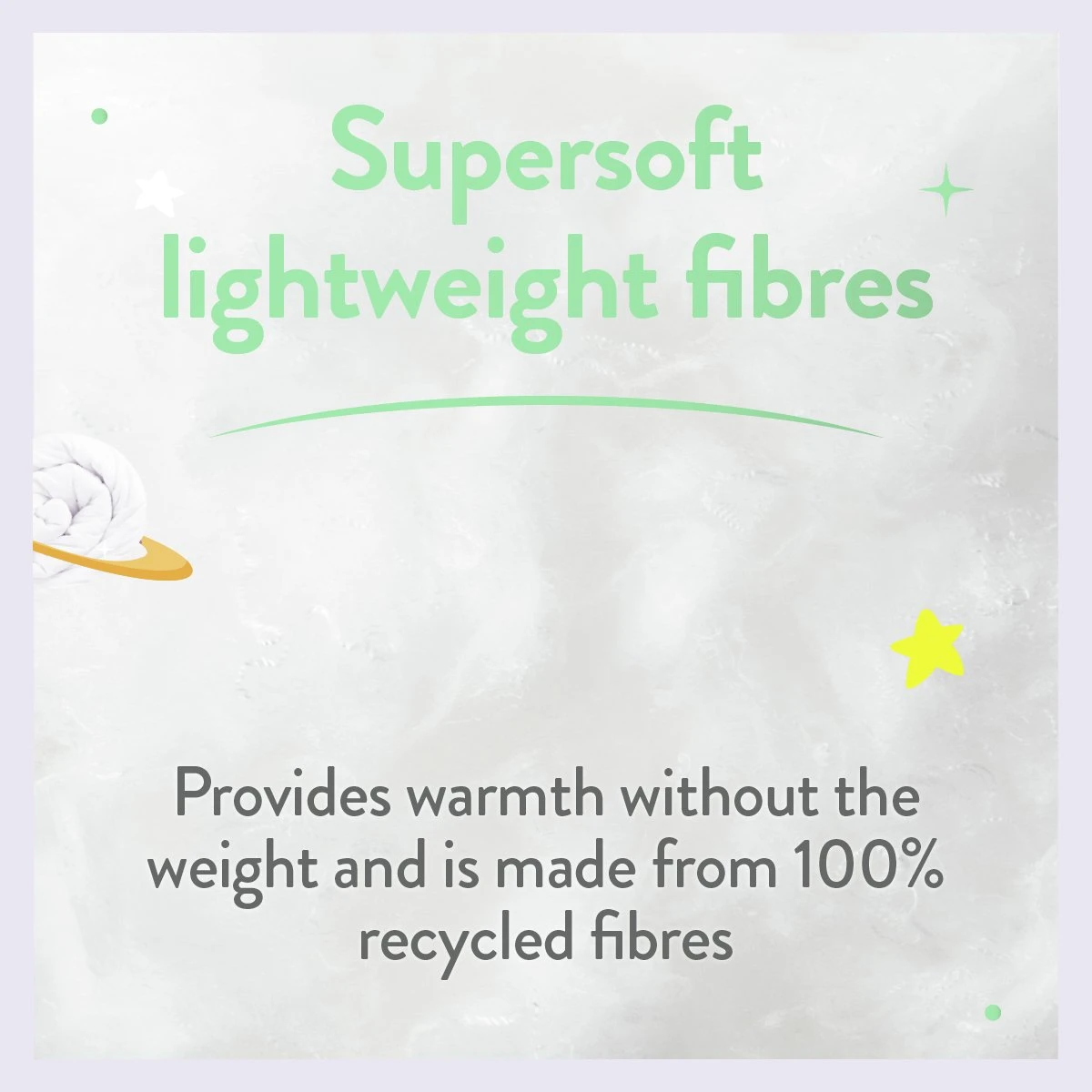 The Slumberdown Little Slumbers Anti Bacterial Cotton duvet has been designed for children. It is carefully formulated with a permanent, antibacterial, antimicrobial, non-harmful odour control treatment, BI-OME® which protects textiles from the build-up of dustmites and odour causing bacteria. The reduced fill ensures your little one won’t overheat at night. Independently tested by experts, so your little ones can enjoy a comfier, fresher and healthier sleep space. What’s more this is Easy Care so can be machine washed and tumble dried.