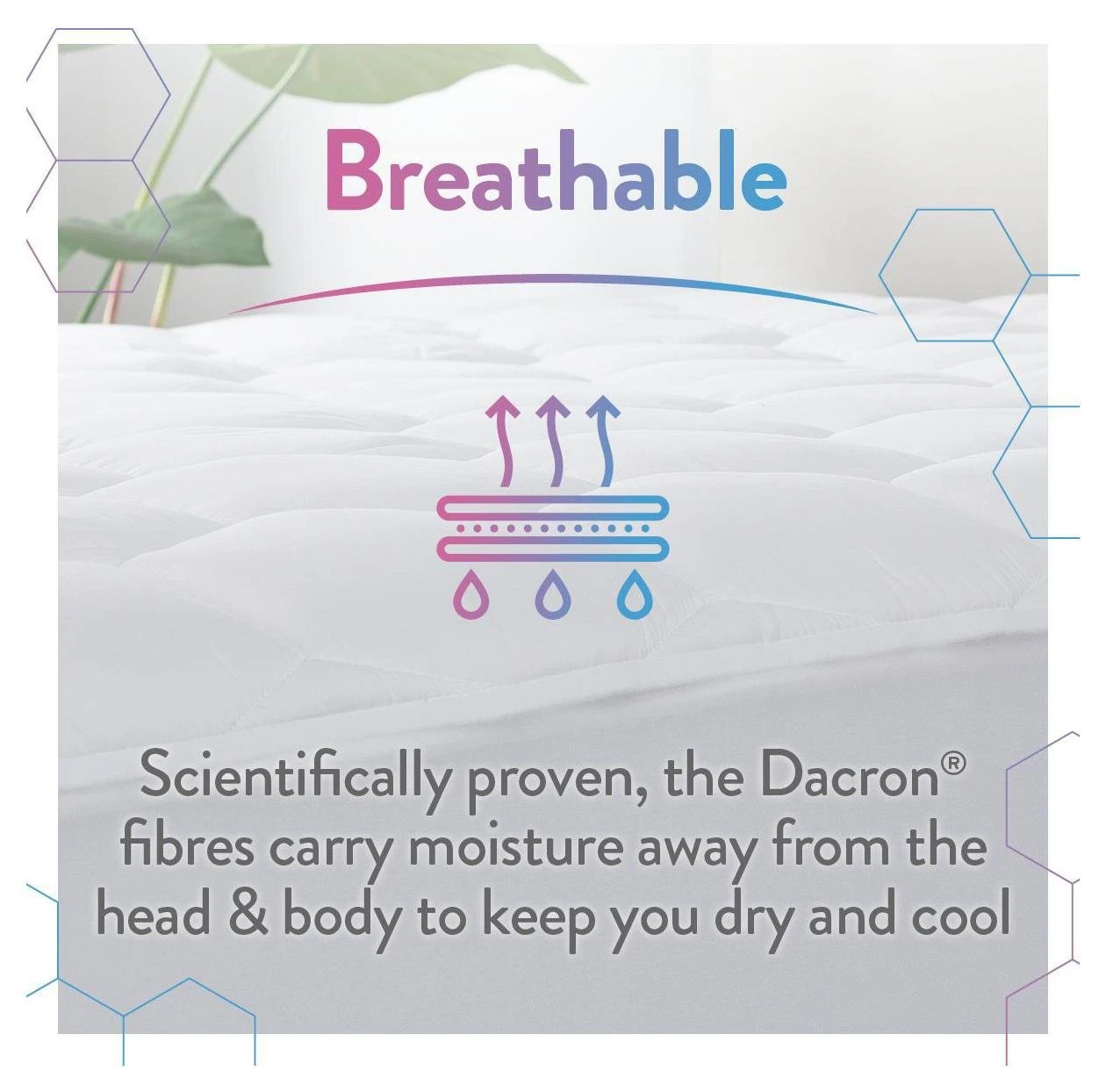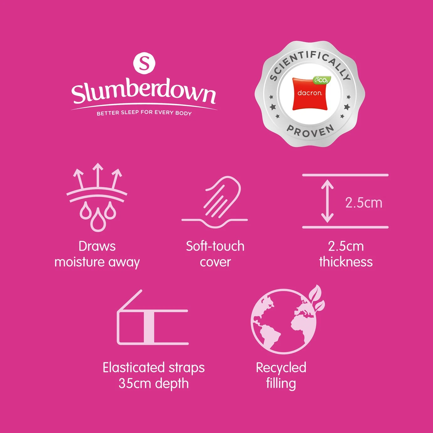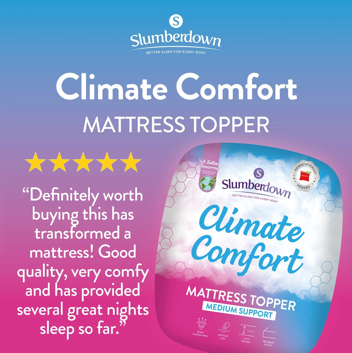 At Slumberdown we believe everybody deserves a better night’s sleep. The Slumberdown Climate Comfort Topper has a breathable filling which wicks away moisture resulting in a cool, dry sleep space. The soft touch cover ensures your mattress is protected from sweat and stains. This quilted topper is 2.5cm deep and fits to your bed with a secure skirt, suitable for mattresses up to a depth of 35cm. What’s more our products are Easy Care which means they can be machine washed to ensure a clean and fresh sleep space.