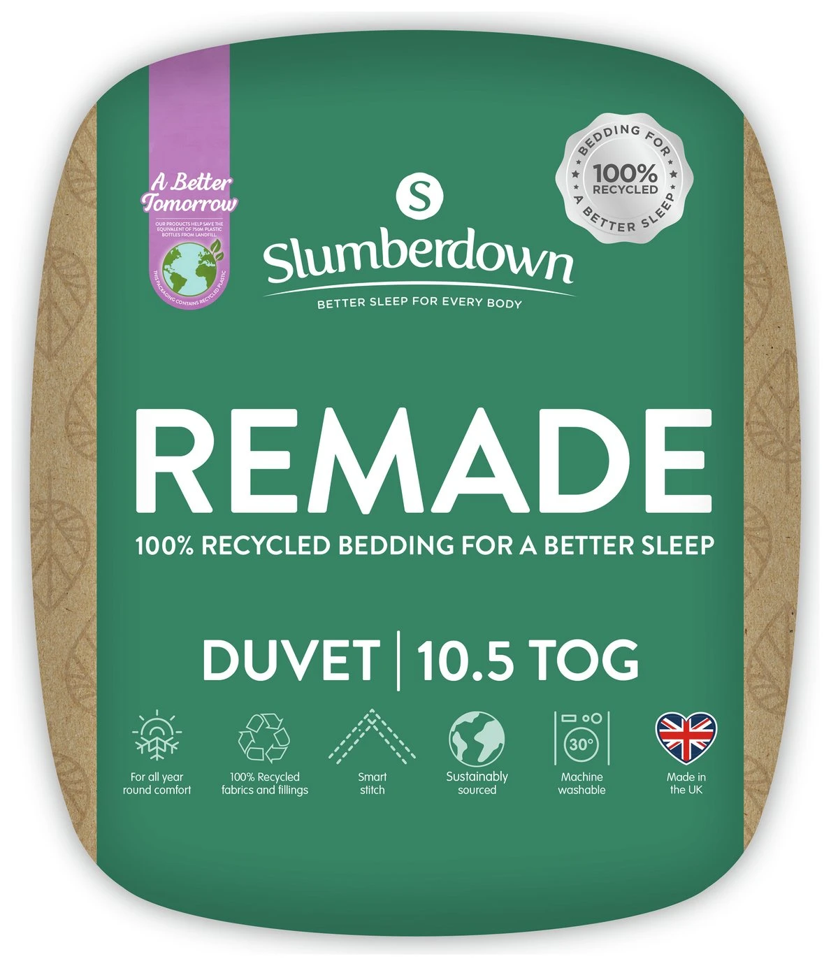At Slumberdown, we believe everybody deserves a better night sleep. The Slumberdown Re-Made 10.5 Tog Duvet is made from 100% recycled materials. The duvet has been designed for all year-round use. The soft touch cover and recycled fibre provide the optimum level of warmth, ensuring have a great night’s sleep. What’s more the product is Easy Care which means it’s machine washable and can be tumble dried.
