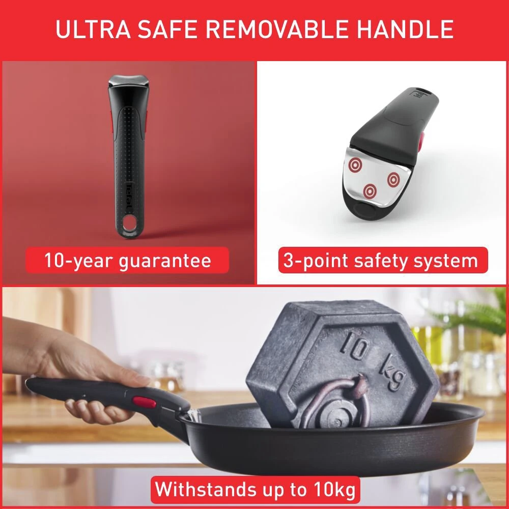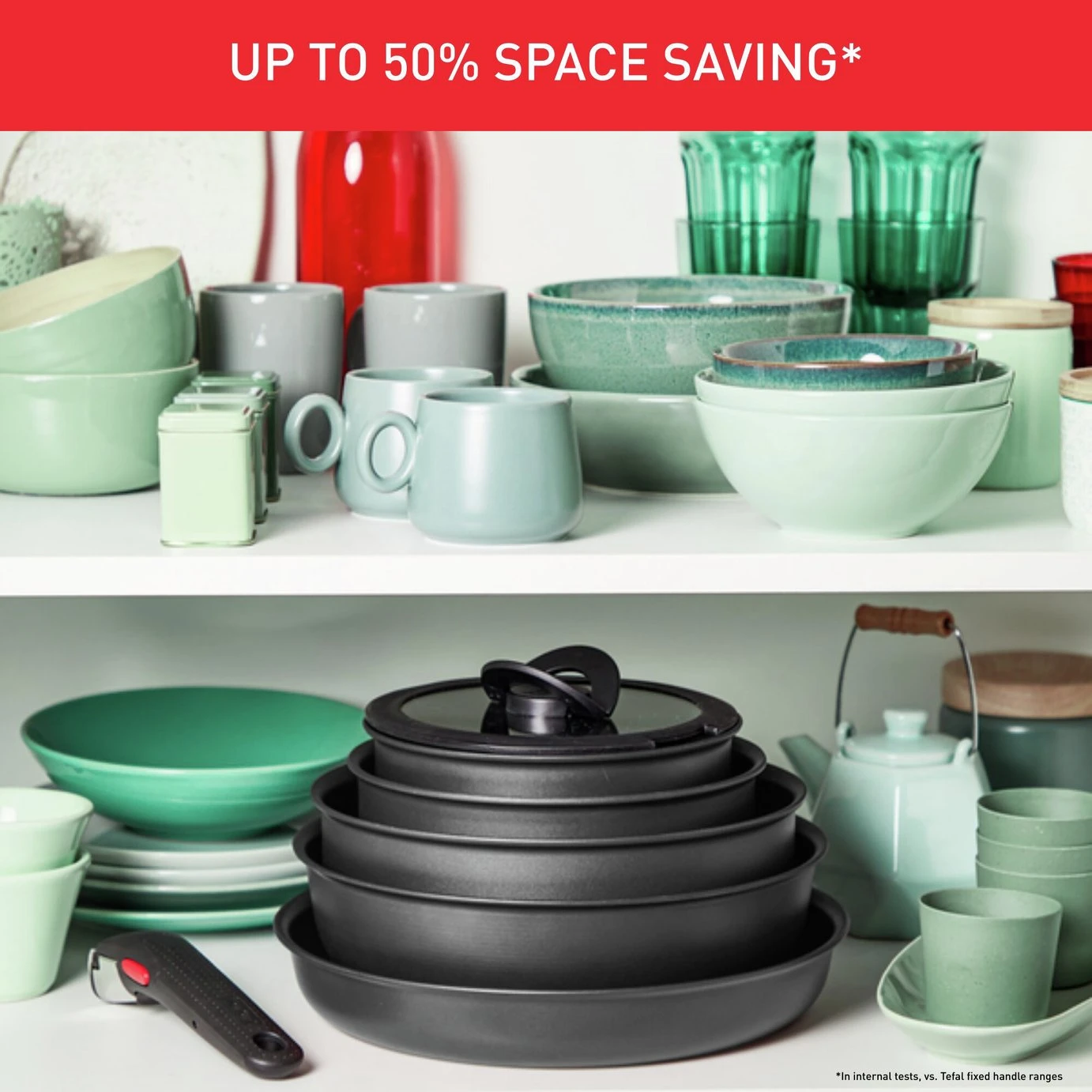 Simplify your cooking with Tefal Ingenio Daily Chef: durable cookware with our iconic removable handle. Ingenio is a total game-changer in the kitchen. Minus the handle, these pans stack inside each other. Plus, it’s a bit of a magician in the kitchen, turning frying pans into oven dishes, and saucepans into bakeware. Start cooking on the hob then move the pan into the oven. Unclip the handle and voila: the pan is a baking tin. The pots also make stylish serving dishes; just use the handle to go from oven to table. Talk about versatile!